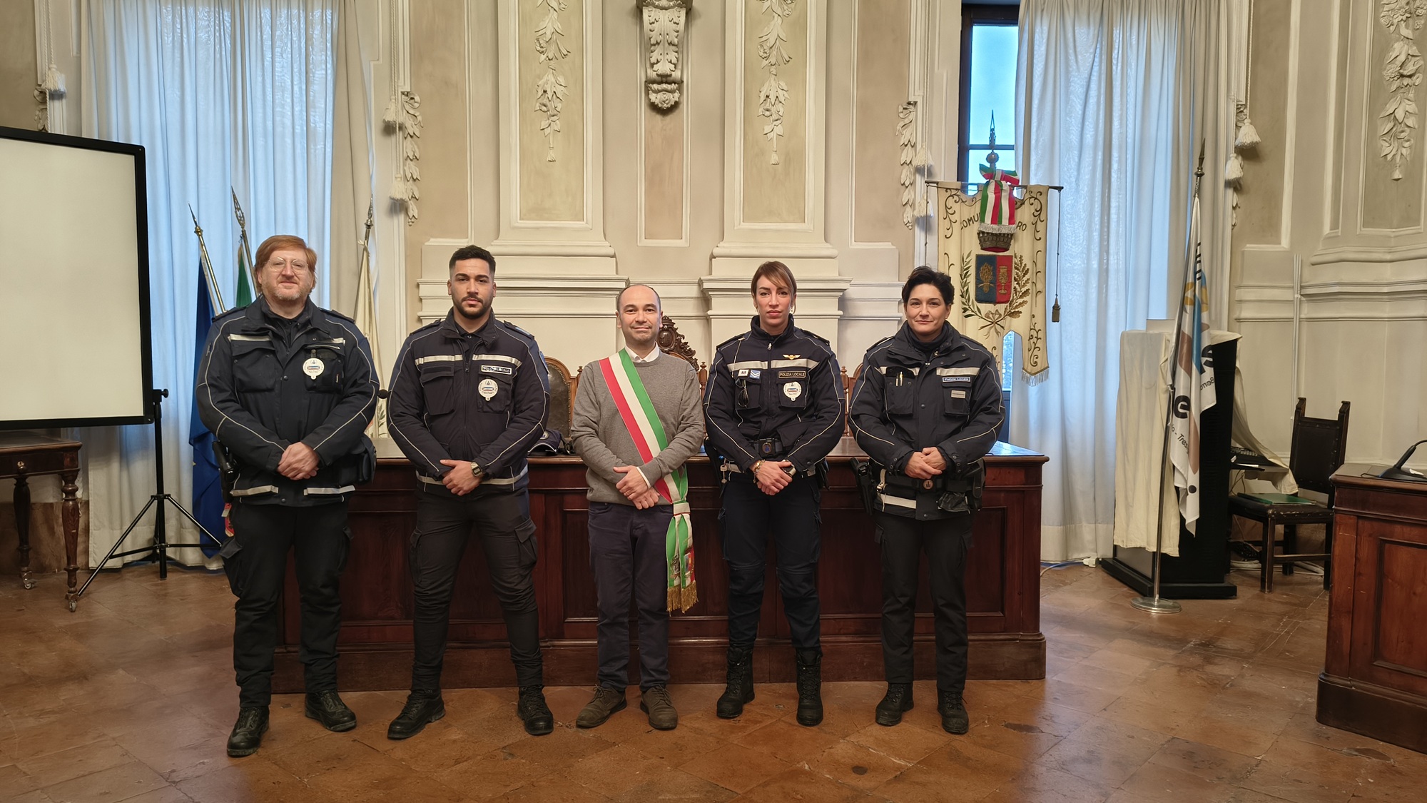 Copparo. L’organico della Polizia Locale Terre e Fiumi si è rafforzato, grazie all’arrivo dei due nuovi agenti Cora Felletti e Samuele Galluccio che, accompagnati dal comandante del Corpo Giulio Sinchetto e dalla sua vice Giovanna Giacomazzi, sono stati accolti nella mattinata di lunedì 1° dicembre nella Residenza Municipale di Copparo dal sindaco e presidente in carica dell’Unione Terre e Fiumi con delega alla sicurezza Fabrizio Pagnoni.