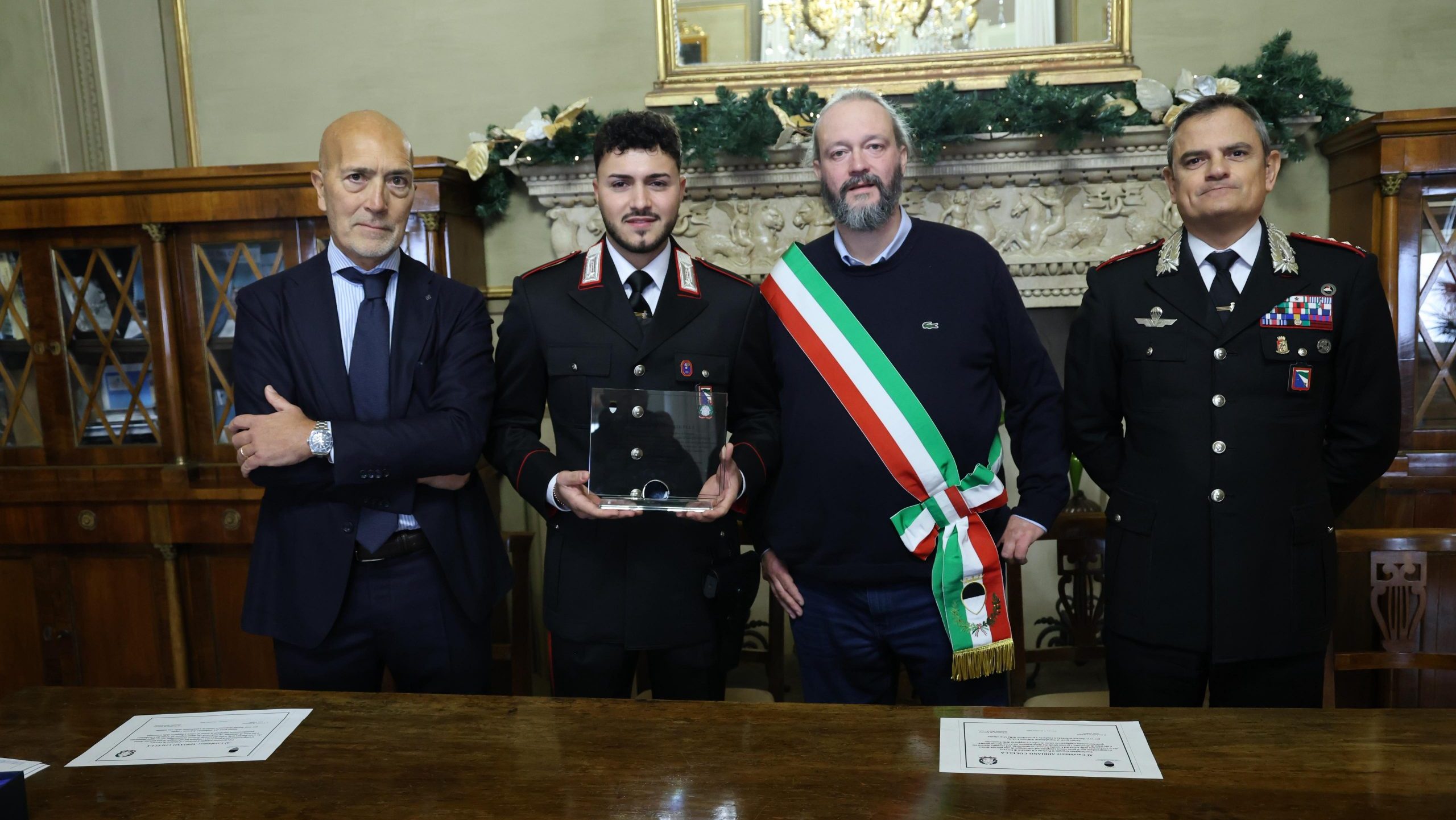 Il sindaco di Ferrara Alan Fabbri e il prefetto Massimo Marchesiello, hanno voluto incontrare il giovane carabiniere, omaggiandolo con una targa di riconoscimento a nome della città per il suo pronto intervento.