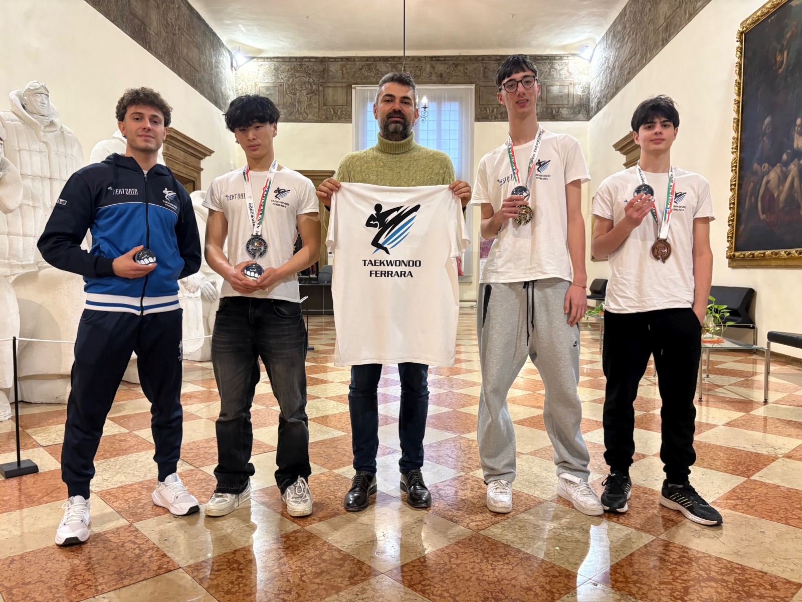 Un bronzo, un argento e un oro. Sono le medaglie conquistate lo scorso giugno a Riccione da tre giovani promesse del Taekwondo Ferrara: Marco Casari, Xu Sheng He e Marco Leprini. A loro e ai loro maestri Francesco Zicarelli e Giuseppe Lodato sono giunte oggi le congratulazioni ufficiali dell’Amministrazione comunale di Ferrara, per voce dell’assessore allo Sport Francesco Carità, che li ha ricevuti nella residenza municipale.