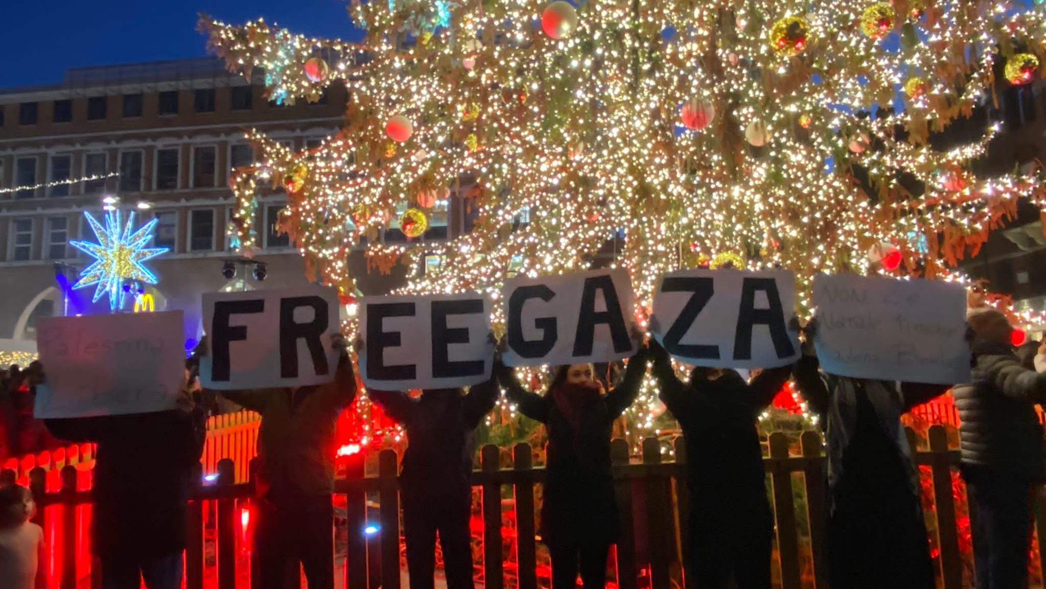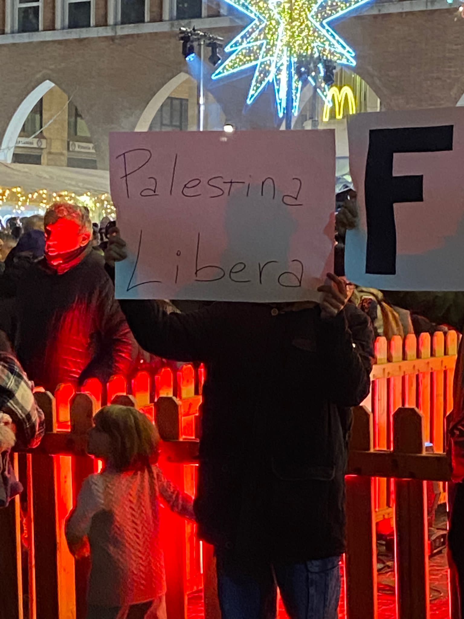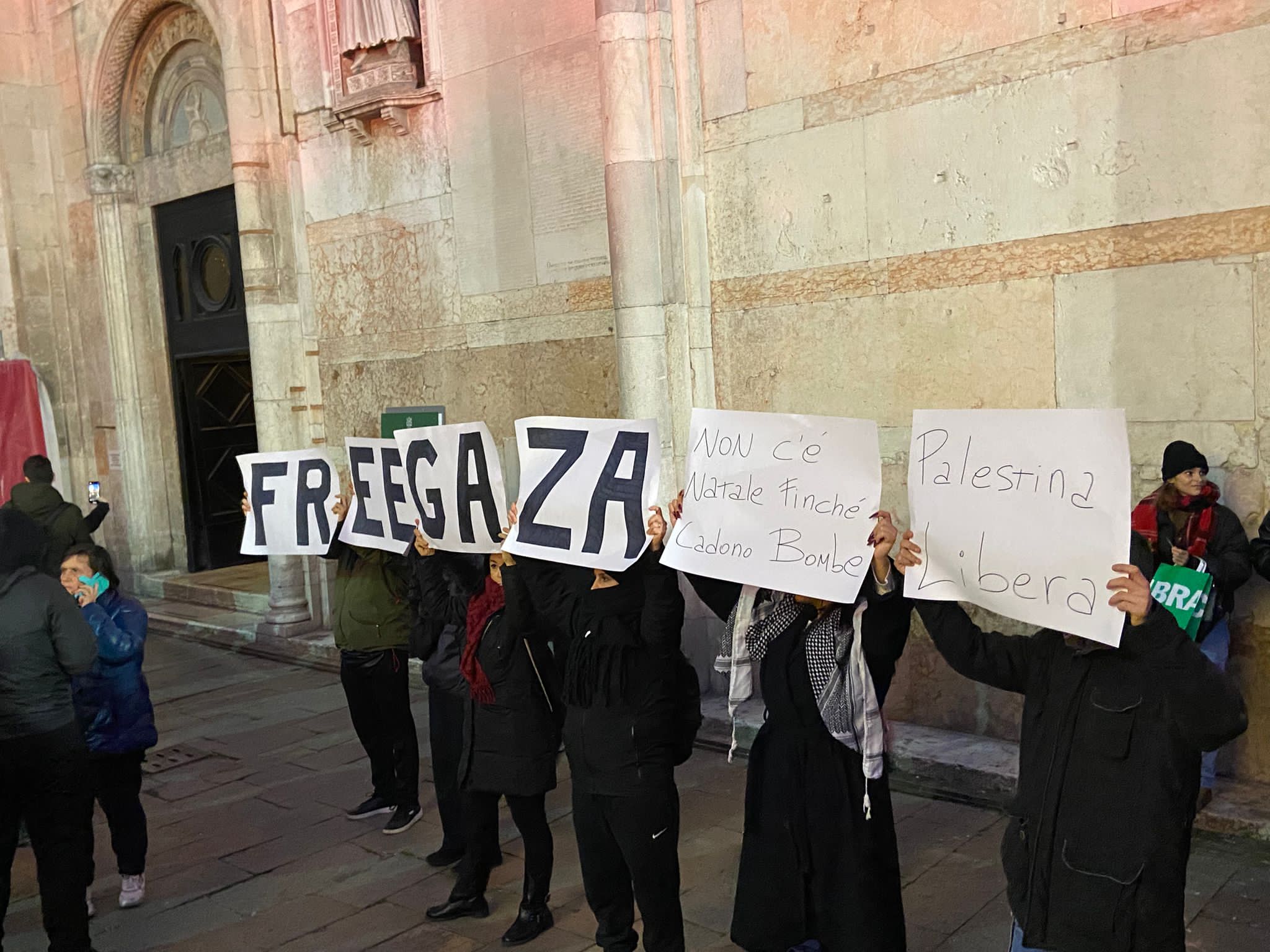 “Free Gaza”, “Palestina libera”. In concomitanza con l’accensione dell’albero di Natale a Ferrara, davanti alla cattedrale, gli attivisti di Ferrara per al Palestina hanno voluto “accendere le luci” anche sulla Striscia ricordando che “non c’è Natale finché cadono bombe”.
