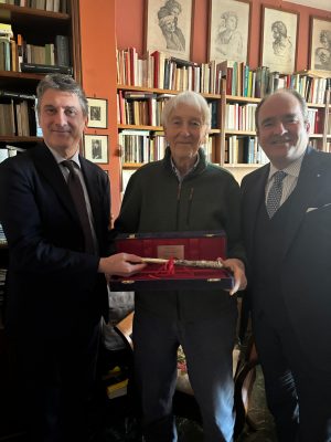 Nei giorni scorsi, Alberto Faustini, presidente della giuria tecnica del Premio Estense, e Gian Luigi Zaina, presidente uscente della Fondazione Premio Estense, hanno incontrato Corrado Augias a Roma per consegnargli la 41^ Colubrina d’Argento, simbolo del “Riconoscimento Gianni Granzotto. Uno stile nell’informazione”, assegnato in occasione della 61^ edizione del Premio Estense che si è tenuta lo scorso 27 settembre presso il Teatro Comunale Claudio Abbado di Ferrara.