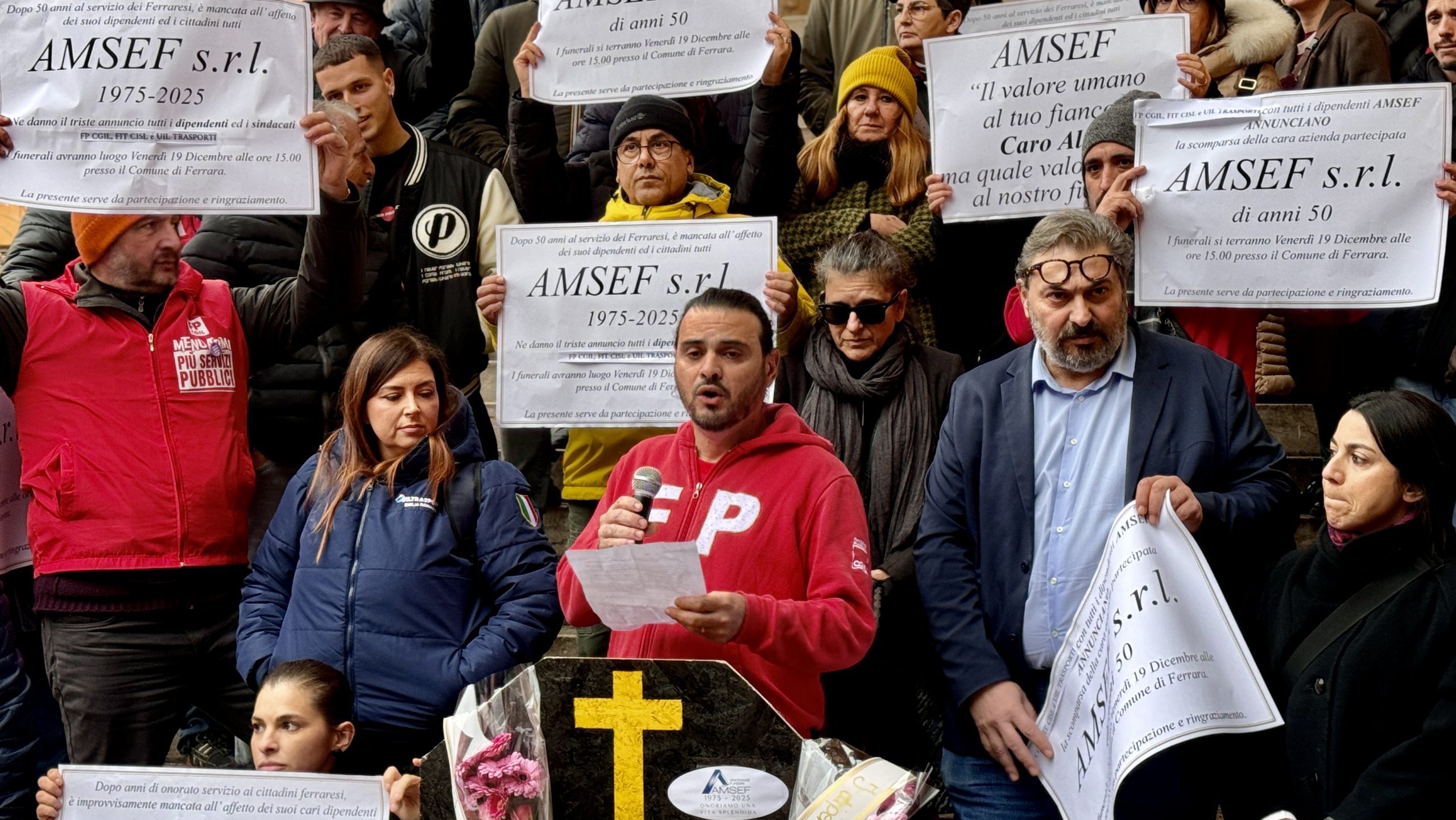 “Amsef 1975-2025. La ricordano con dolore tutte le lavoratrici e i lavoratori. Una morte viva in ricordo di concerti e bevute”. È questa una delle frasi che si legge sull’epitaffio di cartone appoggiato ai piedi dello scalone municipale che ha fatto da sfondo al presidio andato in scena ieri pomeriggio in piazza Municipale. Un’immagine evocativa, scelta da Fp Cgil, Fit Cisl e UilTrasporti per denunciare quella che i sindacati definiscono senza mezzi termini “un’operazione per fare cassa”, a pochi minuti dal Consiglio comunale chiamato a discutere il futuro della società partecipata dei servizi funebri, controllata dalla holding comunale Ferrara Tua e avviata verso la dismissione.