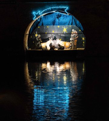 Un rito carico di significato che unisce spiritualità, tradizione e spettacolo, accompagnato da giochi di luce, riflessi sull’acqua e melodie natalizie che rendono l’atmosfera ancora più intensa e raccolta.