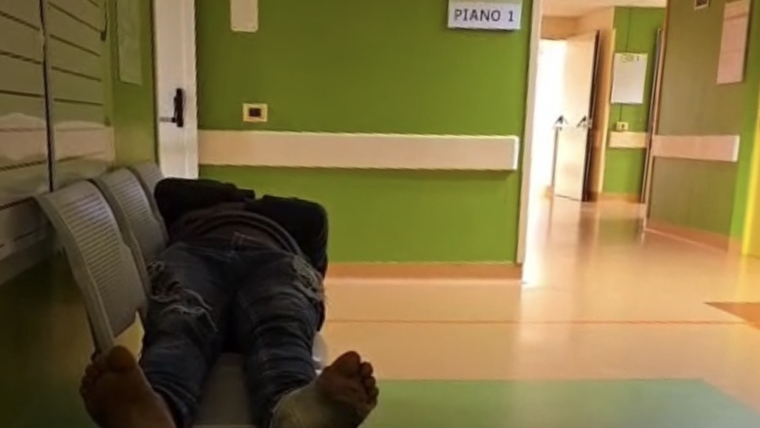 Mentre madri e padri attendevano le visite e i referti dei rispettivi bambini, alcune sedie erano occupate da chi, in teoria, con un pronto soccorso pediatrico avrebbe poco a che fare. Un uomo di circa cinquant’anni, evidentemente senza fissa dimora, si era sdraiato su alcune sedie, facendo il proprio letto.