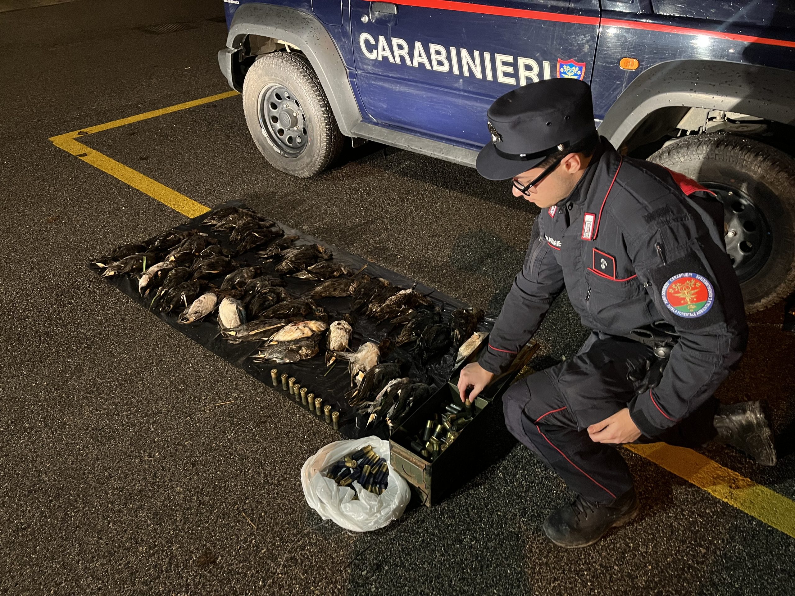 L’attività ha dato esito positivo nei confronti di uno dei due cacciatori, già noto per precedenti specifici, che all’interno della propria auto trasportava un sacco contenente trenta esemplari di alzavola (ben oltre il limite giornaliero di dieci); infatti, lo stesso veniva sottoposto a perquisizione personale e veicolare, da cui emergeva il possesso di un richiamo acustico vietato (con relativa batteria), di circa 150 cartucce al piombo (anch’esse vietate all’interno delle zone umide), di alcuni esemplari di germano reale utilizzati come richiami vivi, ma privi di anello identificativo.
