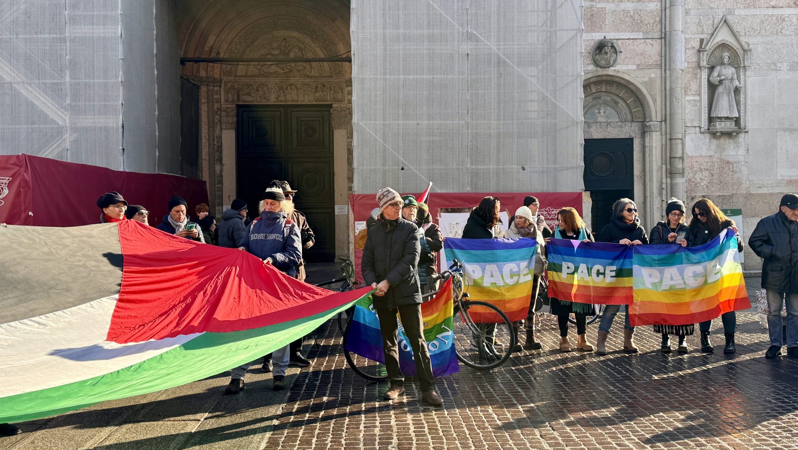 Sotto l’albero di Natale, mentre la città scorreva ancora nel ritmo sospeso delle feste, circa duecento persone si sono raccolte per la pace. In piazza Cattedrale, il primo giorno dell’anno è stato un gesto collettivo per ribadire che il no alla guerra e al riarmo non è astrazione, ma una scelta politica, quotidiana e urgente.