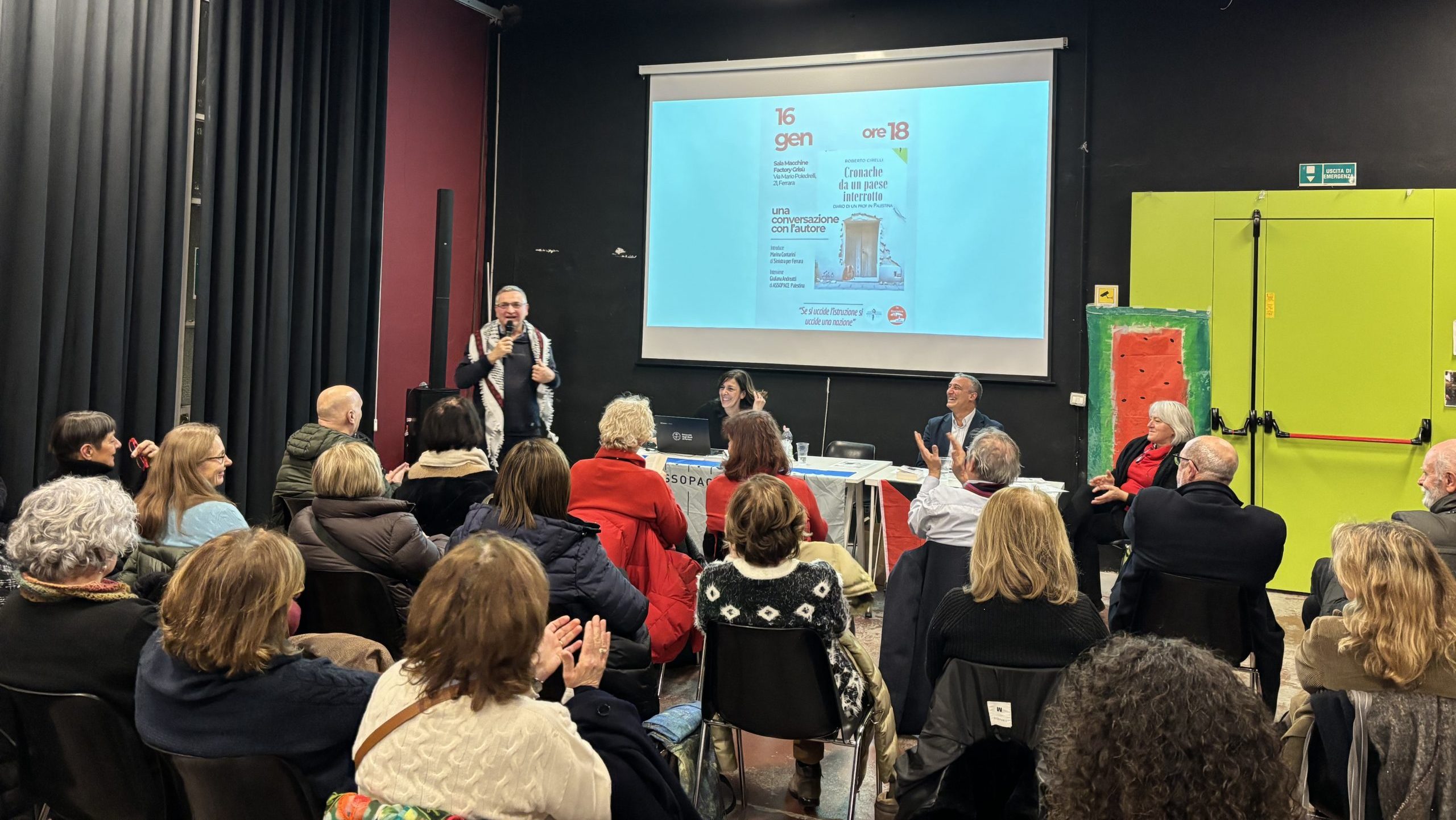 Le iniziative in città a sostegno del popolo palestinese continuano a raccogliere un affidabile e costante interesse. Un’ottantina le persone che, venerdì pomeriggio, 16 gennaio, alla Factory Grisù hanno assistito alla presentazione del libro scritto dal lettore di lingua italiana all’università palestinese di Birzeit, Roberto Cirelli, che in ‘Cronache da un paese interrotto’ (Gemma Edizioni, 2025) ha raccontato la quotidianità di quella terra dalla prospettiva di chi, come lui, ci ha vissuto e insegnato per sei anni.