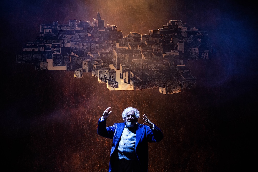 “Pirandello amava dire che il lavoro dell’autore terminava quando egli riusciva a mettere la parola ‘fine’ alla scrittura teatrale. Bene, questo copione ha la parola fine, messa nell’ultima pagina. Tuttavia mi sento di chiosare il buon Luigi: è proprio nella messa in scena che inizia un nuovo viaggio del testo, sempre diverso e sempre nuovo, sempre imprevedibile, sempre disperatamente esaltante. Per questo il confine del teatro è come l’orizzonte dei viaggiatori nei mari d’Oceano: sempre presente, mai raggiungibile”. Così Camilleri nelle note di regia esprime l’animo con il quale ha affrontato questa trasposizione: ha voluto che avesse vita propria, autonoma dal proprio romanzo. La soluzione trovata insieme a Giuseppe Dipasquale è stata la salvaguardia della “scomposizione temporale del romanzo”, ma localizzata in un unico luogo, al tempo stesso “un teatro (quello, per esempio, dove poteva essere avvenuto l’incendio) e il luogo dell’azione del racconto”. Efficace l’idea di infrangere la quarta parete e ‘coinvolgere’ da subito il pubblico in sala nell’episodio dell’incendio: un espediente che è in piena linea con l’ironia di Camilleri. Poetica l’immagine scelta da Antonio Fiorentino, che cura la scenografia, di porre Vigàta sullo sfondo e al centro nello stesso tempo, come a dire che è la parte per il tutto, una sorta di archetipo della Sicilia della topografia camilleriana.