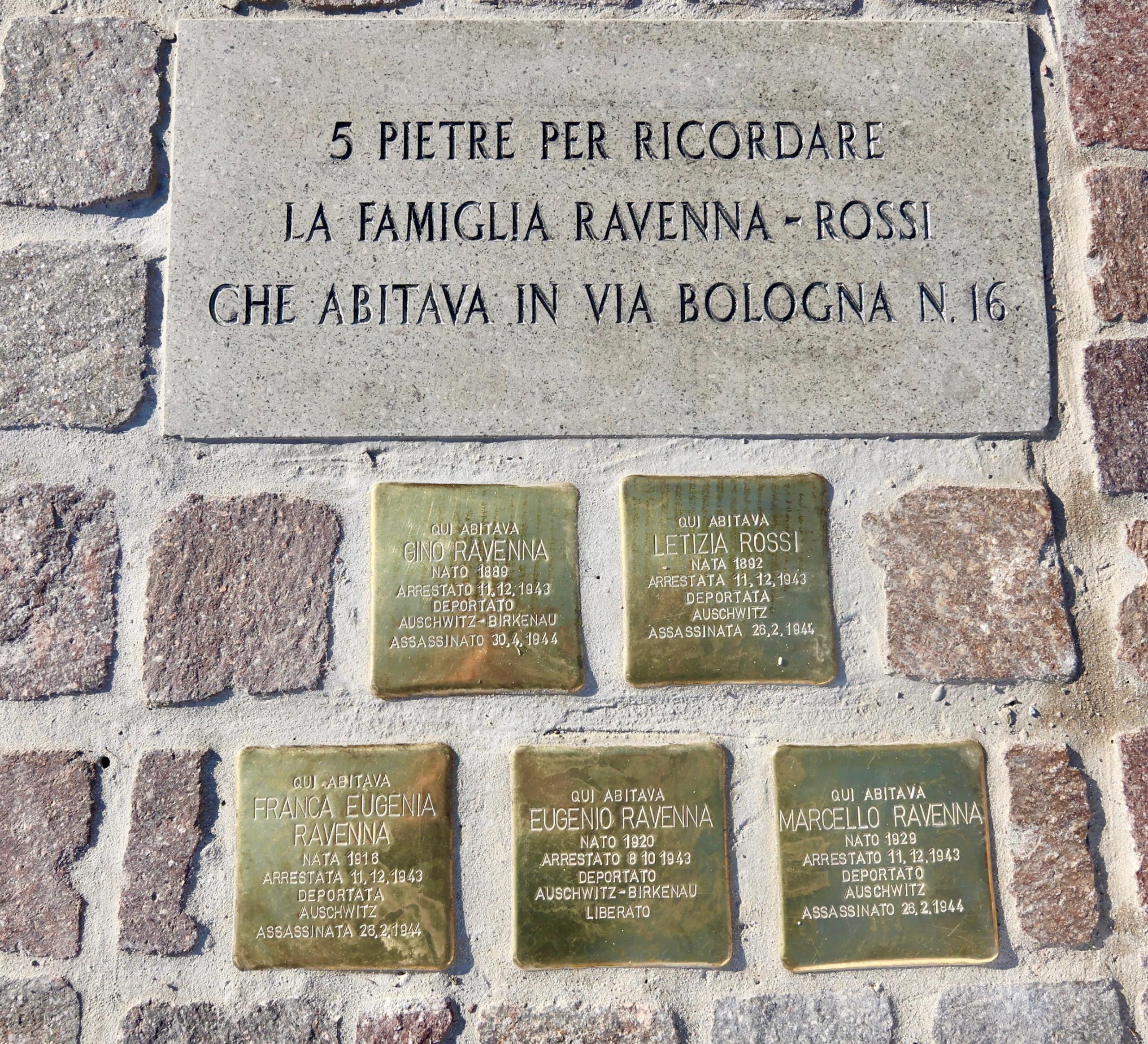 La famiglia Ravenna-Rossi era composta da Gino Ravenna, Letizia Rossi, Franca Eugenia Ravenna, Eugenio Ravenna e Marcello Ravenna ed è stata arrestata a Domodossola nel 1943, mentre cercava di raggiungere la Svizzera. Trasferiti prima a Ferrara nel carcere di via Piangipane e poi nel Campo di transito di Fossoli (Mo), il 22 febbraio 1944 arrivarono nel lager di Auschwitz, dove tutti troveranno la morte tranne Eugenio, uno dei pochissimi sopravvissuti ferraresi alla Shoah. Cugino di Giorgio Bassani, la sua storia ispirerà il racconto Una lapide in via Mazzini, dove lo scrittore trasformerà Eugenio nel personaggio di Geo Josz.