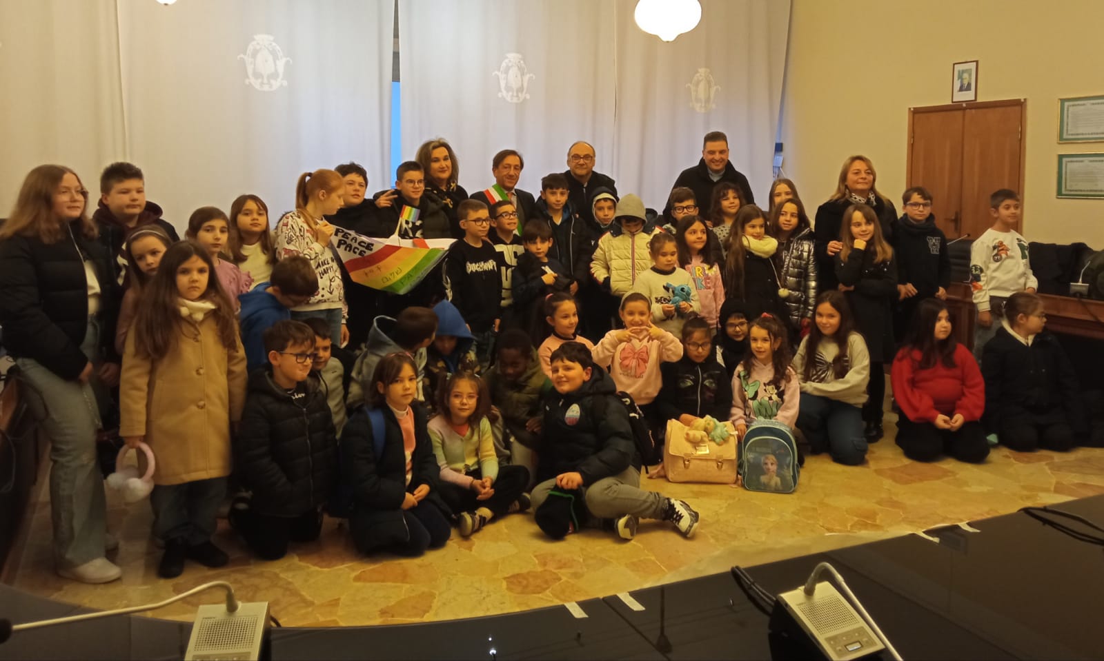 In sala del Consiglio, dopo il discorso sulla pace del sindaco Pierluigi Negri e l’intervento di alcuni rappresentanti delle associazioni, una bambina e un bambino della delegazione hanno poi letto rispettivamente una poesia e una riflessione sul tema e hanno consegnato, insieme alle insegnanti, i lavori realizzati in queste ultime settimane e creati riflettendo sul concetto di pace, invitando anche l’Amministrazione comunale a farsi carico di diffondere questo importante messaggio con la distribuzione a tutti i consiglieri comunali, nella seduta che si terrà il 29 gennaio, del messaggio sulla pace di papa Prevost.