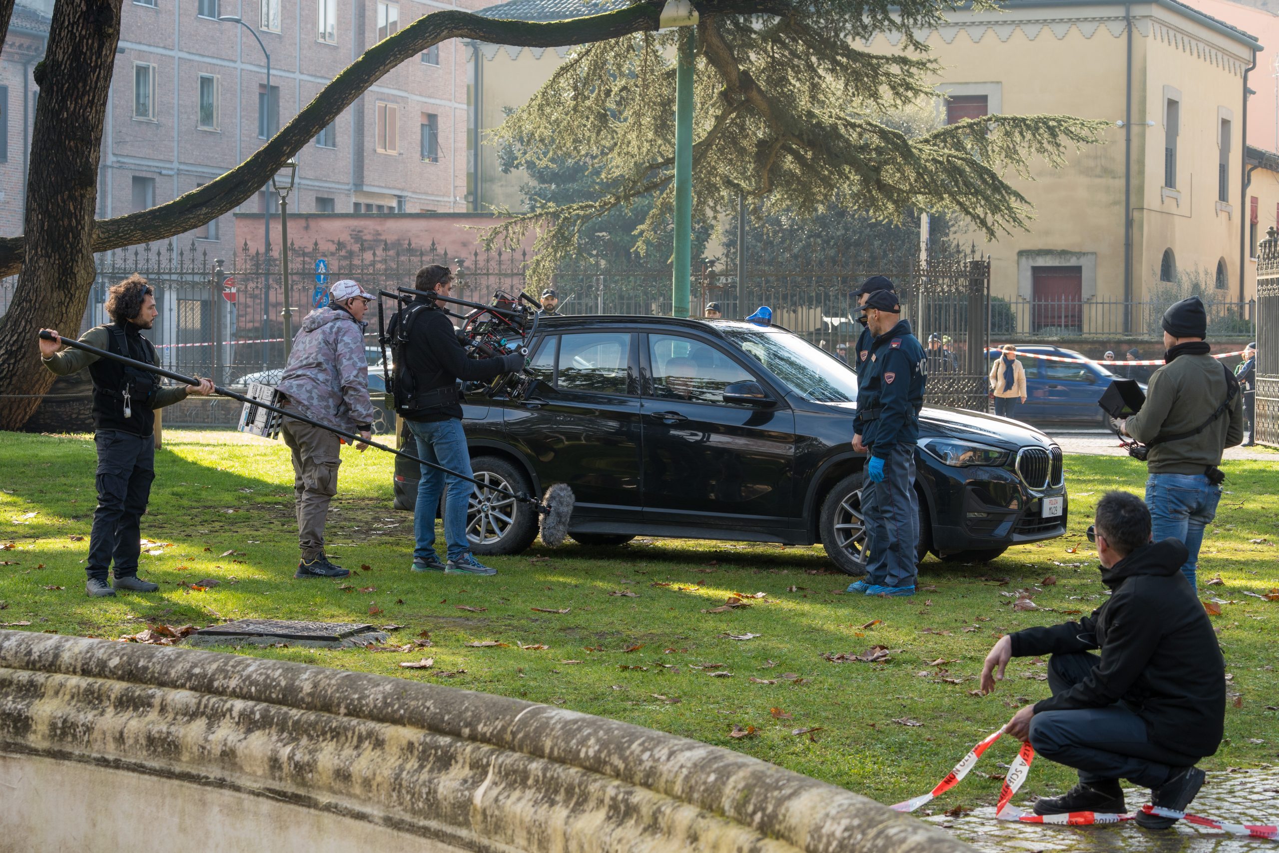 Un nastro bianco e rosso chiude l’accesso del Parco Massari. Passando da corso Porta Mare. Appena oltre il cancello, ecco comparire delle volanti della Polizia, la Scientifica, perfino la Mortuaria. Ma è tutto parte del set cinematografico che, dal 7 febbraio e per qualche settimana, animerà la città estense.