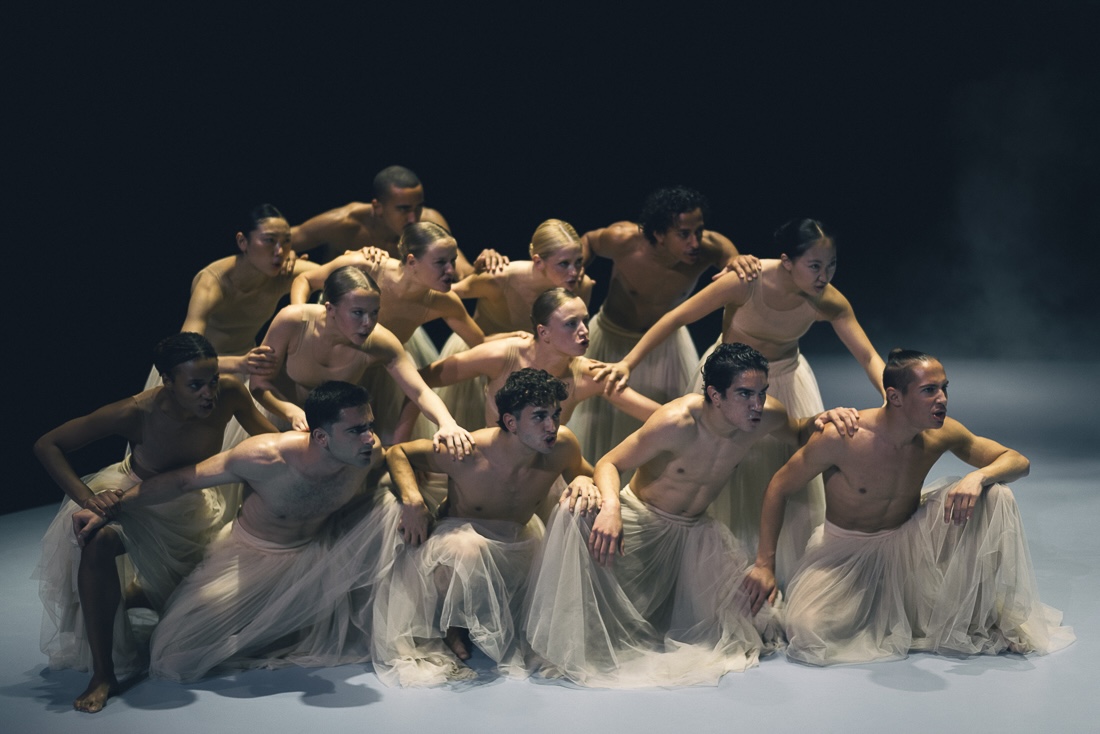 Si passa poi a “Wir Sagen Uns Dunkles” del tedesco Marco Goecke e il gesto, ancora spezzato e meccanico, si fa frenetico e nevrotico. Il coreografo sfida gli interpreti in soli, pas des deux o momenti d’insieme, con movimenti rapidi, spigolosi e vibranti. Il titolo del pezzo in italiano suonerebbe “Ci raccontiamo cose oscure” e i danzatori rendono appunto leggibile un linguaggio che sembra voler esprimere l’inquietudine e la fragilità emotiva che è la cifra dei nostri tempi. Anche qui le scelte musicali sono indubbio valore aggiunto con le musiche dei Placebo che incontrano e si intrecciano con Schubert e Schnittke.