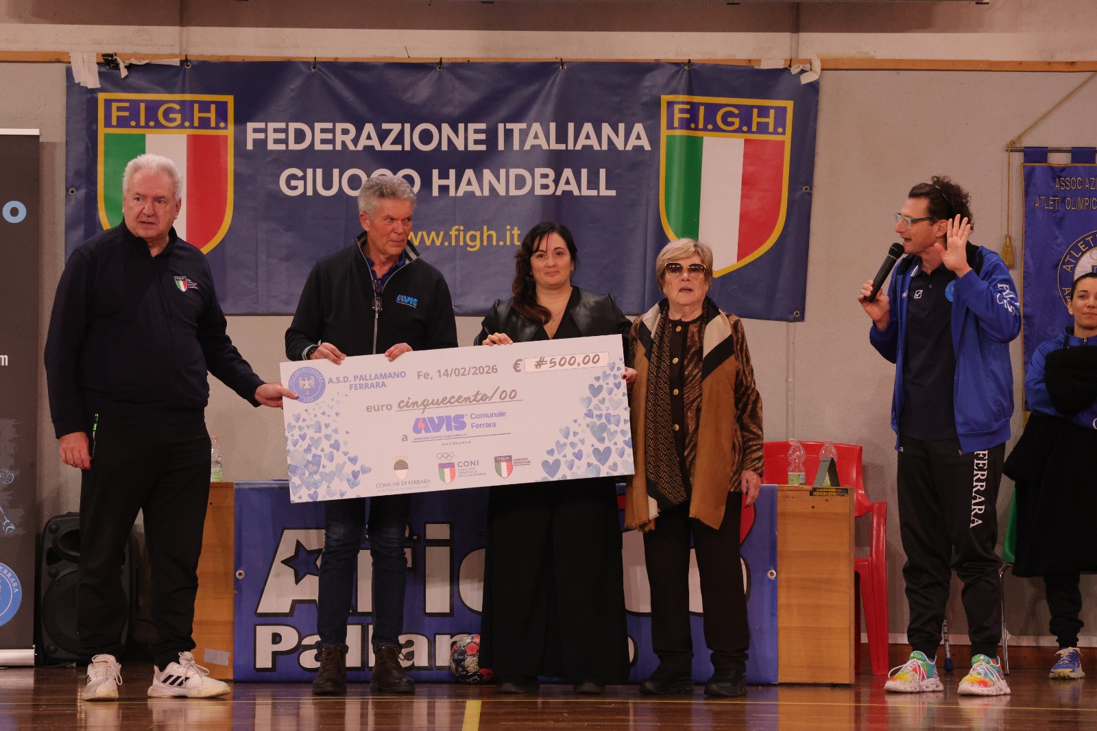 Ma, come detto, al Palaboschetto oltre alla partita c’era di più: c’era tutta la voglia dello sport di essere parte attiva e propositiva della collettività, e con “noi ci mettiamo il cuore”, Pallamano Ferrara ha vinto il secondo incontro di giornata. L’evento, pensato per AVIS Comunale Ferrara e il Giardino dei Donatori, è stato tenuto a battesimo dall’Assessore allo Sport Francesco Carità, il testimonial dei valori olimpici, attraverso il compito di tedoforo affidatogli dal Comune, Mirco Antenucci, e la “Signora dello Sport” ferrarese Luciana Boschetti Pareschi, oggi in veste di Presidente della sezione di Ferrara dell’Associazione Atleti Olimpici e Azzurri.