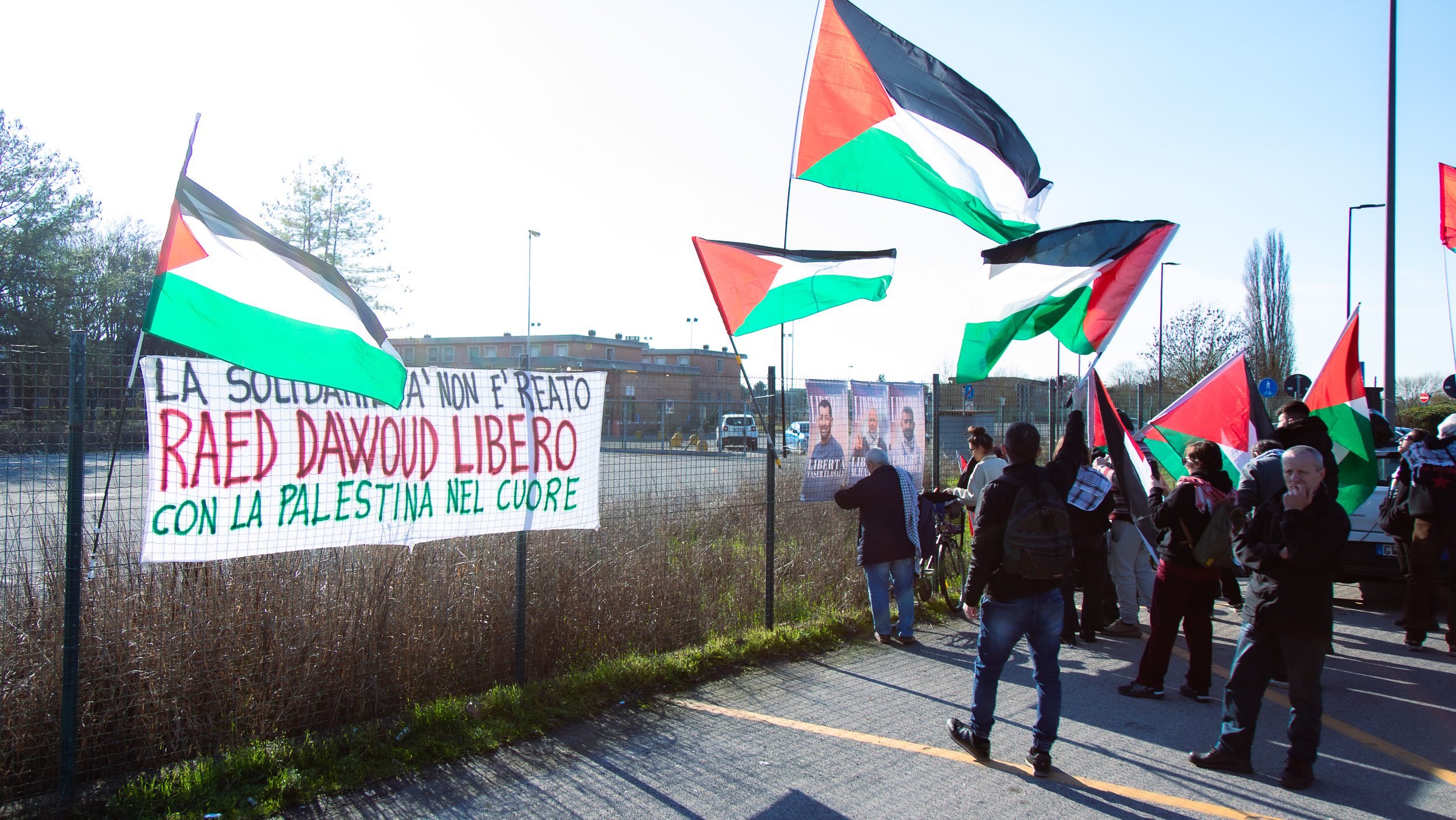 Sono diverse decine di persone quelle che ieri sabato 21 febbraio si sono radunate pacificamente fuori dal carcere di Ferrara esponendo striscioni e chiedendo la liberazione degli arrestati – indagati per associazione con finalità di terrorismo – e denunciando quella che definiscono una “criminalizzazione della solidarietà” verso il popolo palestinese.