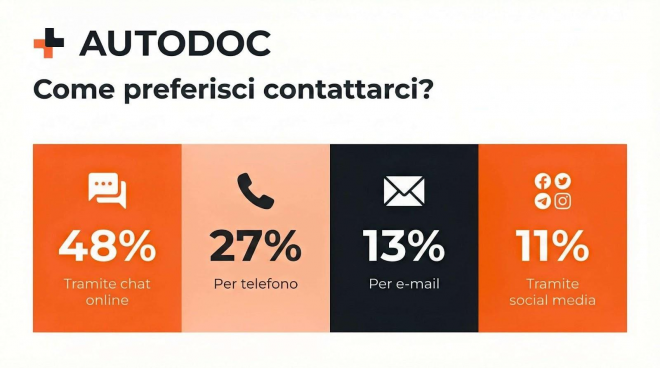 Secondo un sondaggio condotto da AUTODOC tra i propri follower su Instagram, le chat online sono scelte dal 48 % dei rispondenti, quasi il doppio rispetto alle telefonate (27 %). L’e-mail si piazza al terzo posto con il 13 %, mentre i social network sono scelti dall’11 % dei partecipanti.*