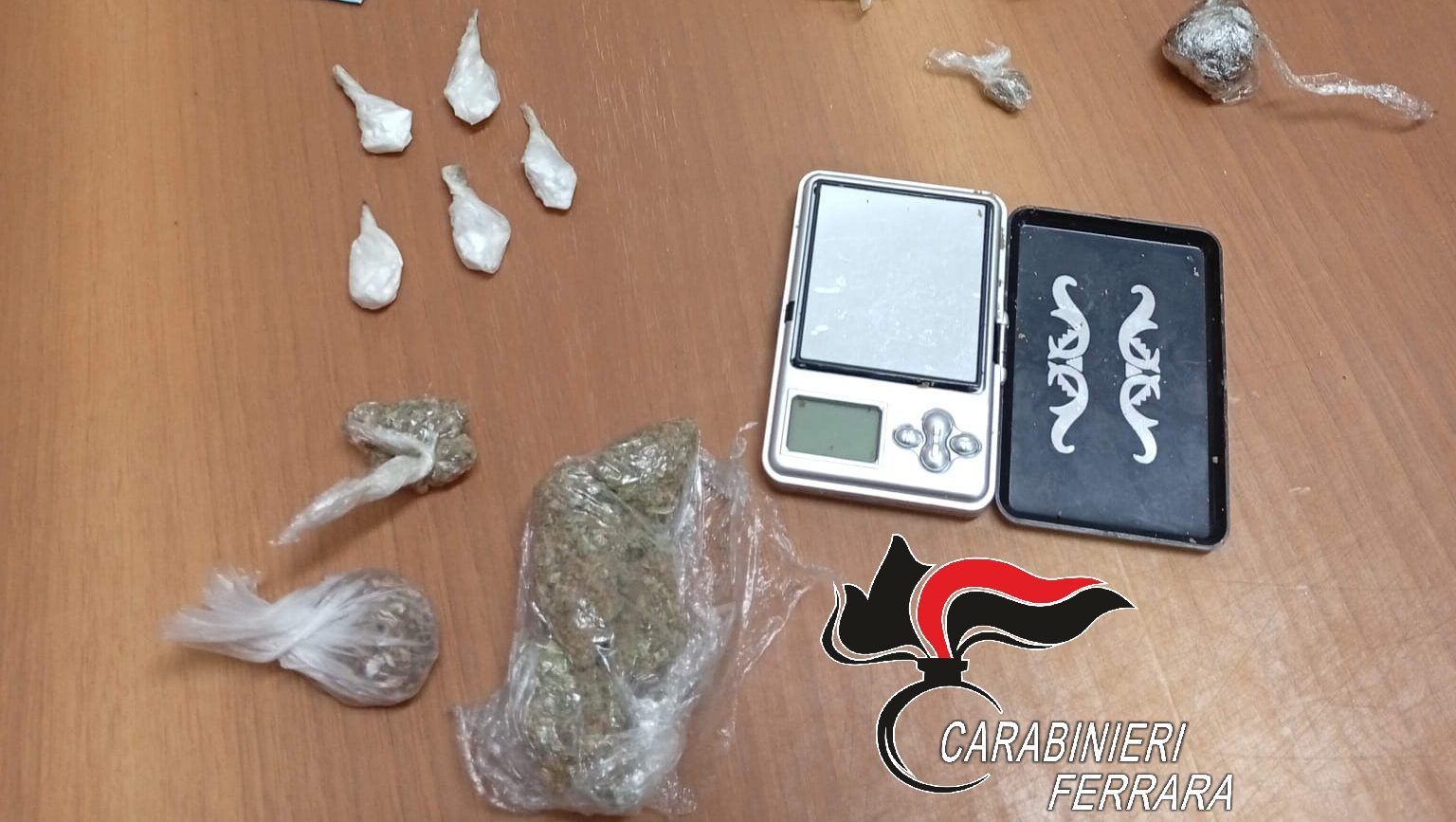 Nel corso della perquisizione sono state rinvenute e sequestrate cinque dosi di cocaina, 23 grammi di hashish e 12 grammi di marijuana, oltre a 160 euro in contanti, un bilancino di precisione e materiale per il confezionamento delle dosi.