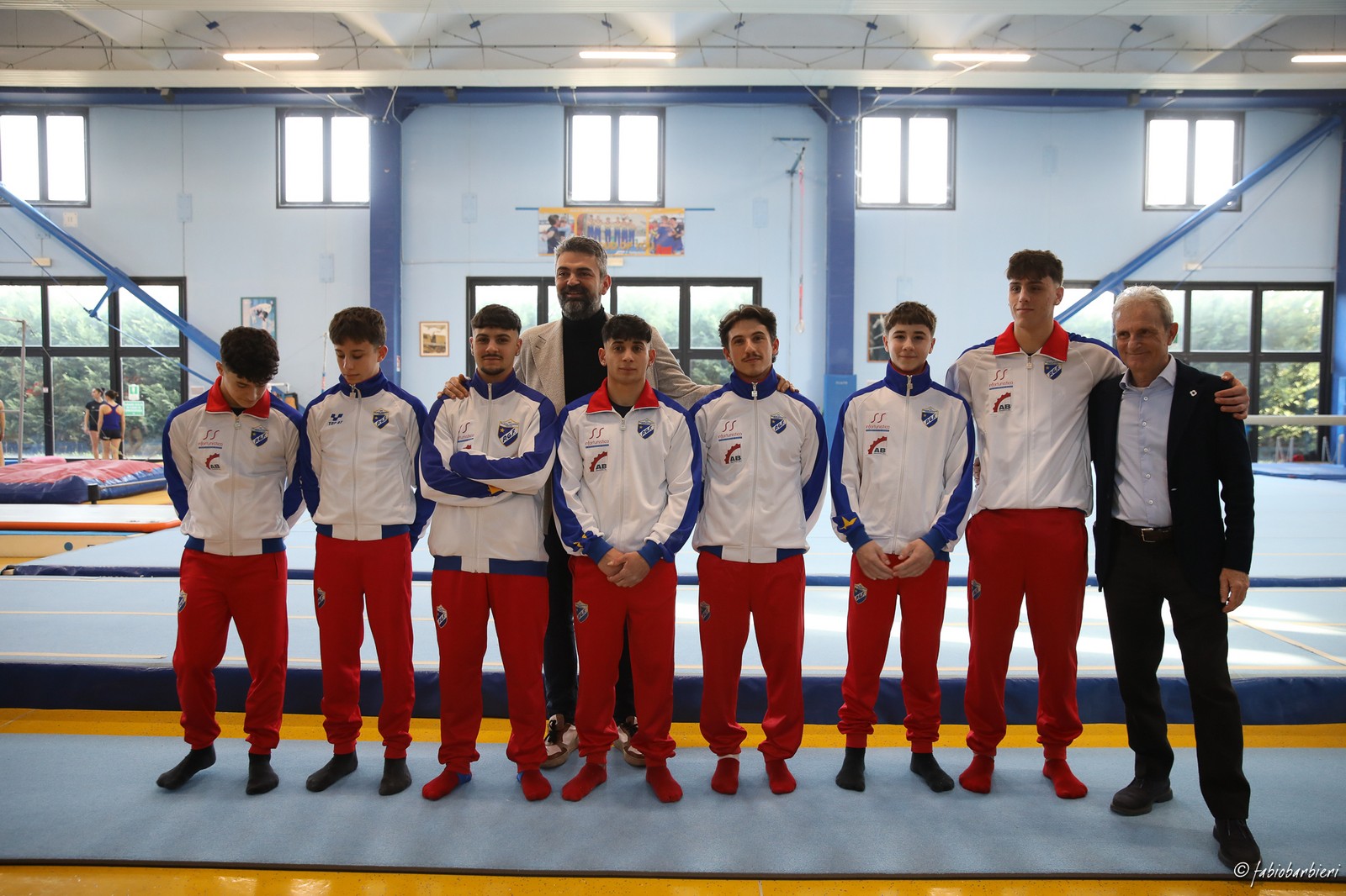 Molto emozionante la parte successiva ai saluti, quando ci si è spostati in palestra per assistere all’allenamento. Squadra che vince non si cambia, al massimo si aggiunge, e per confermarsi ancora come una volta come una delle più belle realtà della massima serie, con una formazione costituita quasi esclusivamente da ginnasti formatisi nel vivaio interno, la formazione di quest’anno vede protagonisti: Andrea Passini, il capitano, Steven Matteo, entrato a fine anno nel gruppo di maggior attenzione per la formazione della squadra Nazionale, Tommaso Bertarelli, finalmente pronto per un rientro completo, Emiliano Landi, il veterano e specialista del cavallo con maniglie, i giovanissimi Andrea Bertasi e Luca Marchi, chiamati ad esordire lo scorso anno e subito fondamentali, Christian Zammillo, subito ripagato della scelta di trasferirsi qui per cercare il grande salto, il fuoriclasse ucraino di nascita ma fresco di nazionalità croata Illia Kovtun, Argento Olimpico sulle parallele di Parigi, e il nuovo arrivo Edoardo Sugamele, romano classe 2004, già Campione Italiano Senior nel 2024.