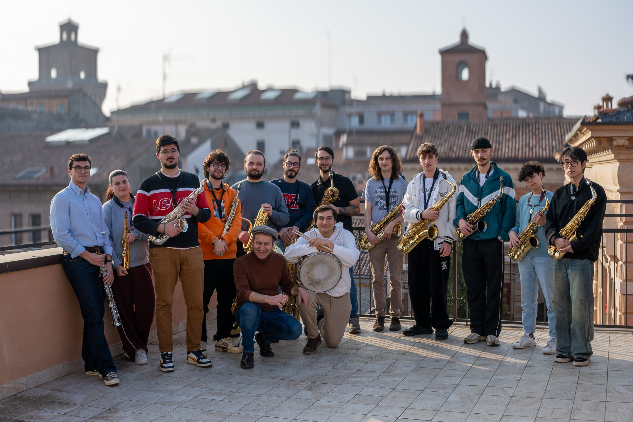L’orchestra di sax dei Conservatori di Ferrara e Fermo è composta da: Larissa Ponzuoli, sax sopranino; Giacomo Turci, Christian Forte, Maria Ventriglia, sax soprano; Chesare Martinez, David Turchanovich, Wu Siyuan, Micaela Mancinelli, Debora Batà, sax alto; Filippo Grassi, Alfredo Carlos Villa, Alberto Zanobetti, Sofia Corsi, sax tenore; Leonardo Pinna, Eduardo Figura, Luca Pastore, sax baritono; Francesco Ranzi, Lorenzo Passamonti, sax basso; Matteo D’Elia, batteria..