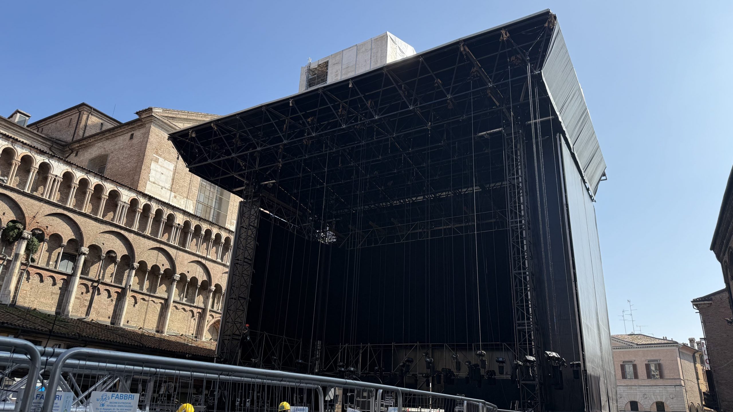 Definiscono il palco “un enorme parallelepipedo nero” ricordando che per la sua costruzione “lo spazio pubblico è stato interdetto alla normale fruizione”. Non solo perché la costruzione “occupa la piazza principale della città, offuscando l’immagine degli edifici monumentali che la circondano”. Contemporaneamente “un autoarticolato, trasformato in stazione radio, occupa il sagrato della cattedrale impedendo la visione della facciata e sparando ogni genere di musica davanti ad un edificio sacro in tempo di Quaresima”.