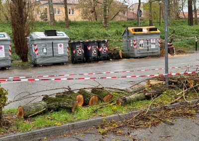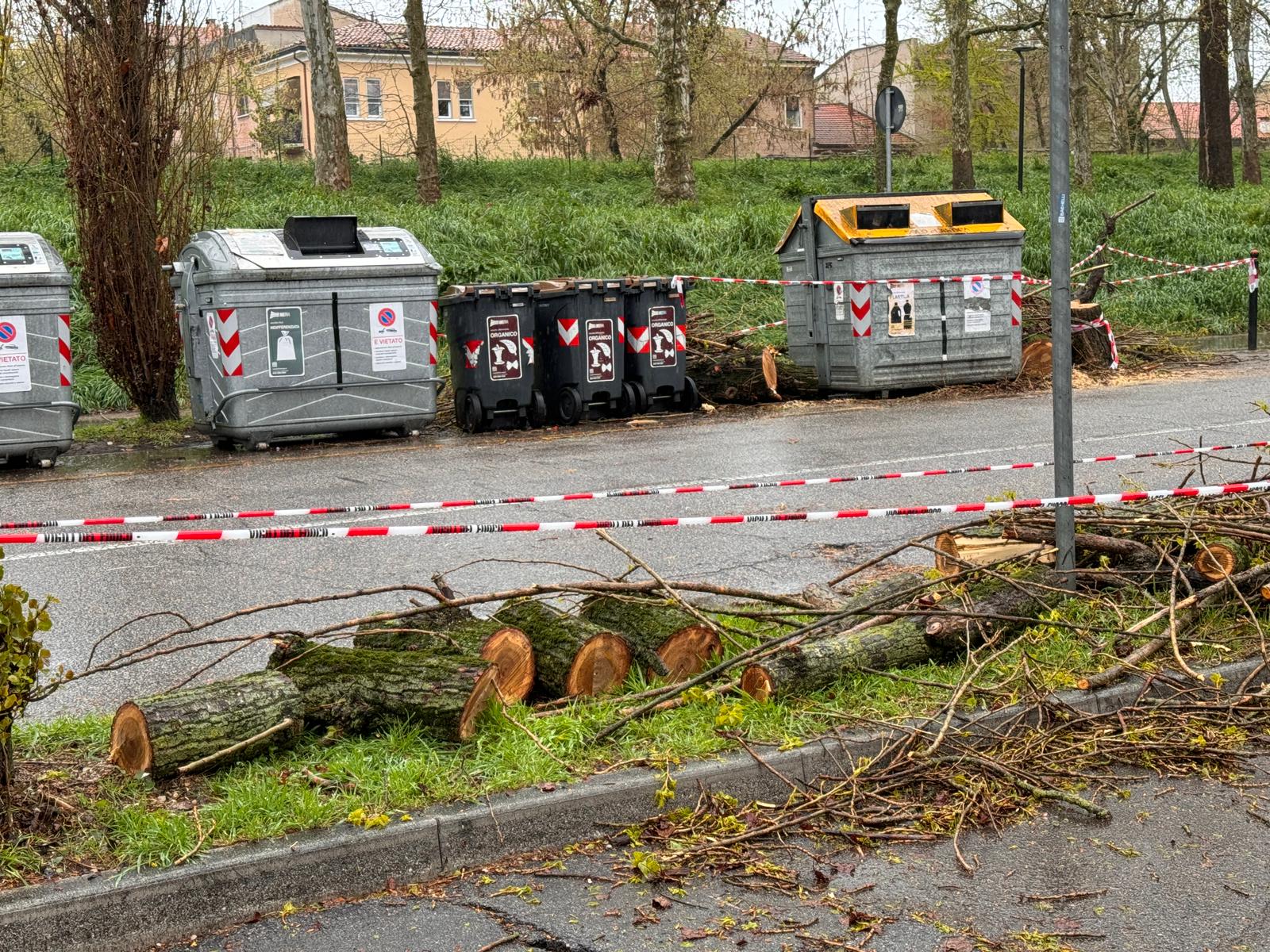 A Ferrara i disagi sono stati creati da rami e cartelli stradali finiti in mezzo alle strade. Un albero è caduto in via Belvedere e ora è stato segato per consentirne la rimozione.