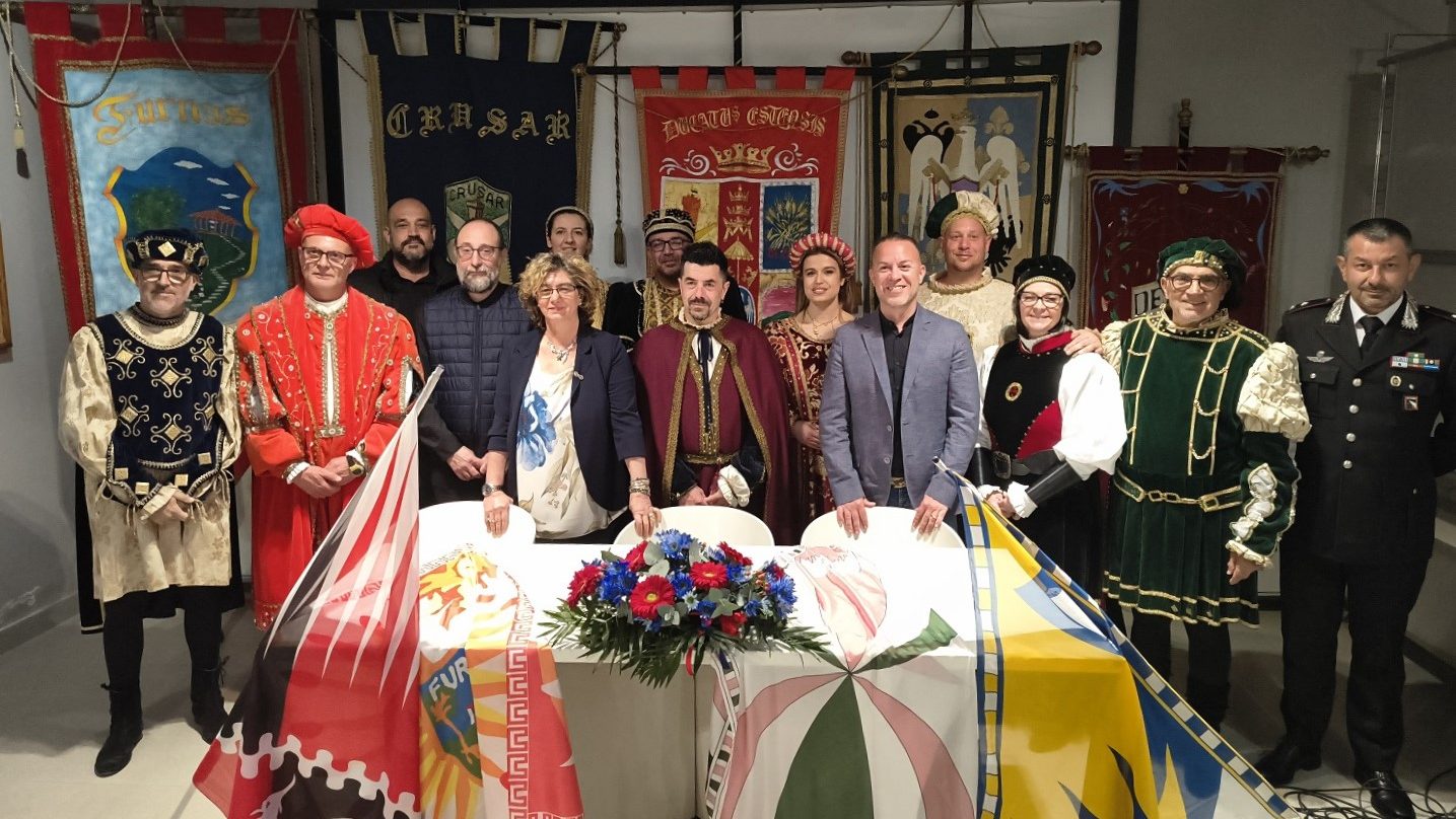 Copparo. L’inconfondibile suono delle chiarine ha accompagnato l’incedere della Corte Ducale e delle bandiere dei rioni Crusar, Dezima, Furnas, Mota da piazza del Popolo alla Galleria civica “Alda Costa” sotto gli occhi dei cittadini che vivevano il cuore cittadino. Così si è aperta – nel pomeriggio di venerdì 10 aprile – la presentazione della 47esima edizione del Palio di Copparo, la storica manifestazione rievocativa del tempo degli Estensi pronta a coinvolgere l’intera comunità e ad aprirsi ai visitatori.