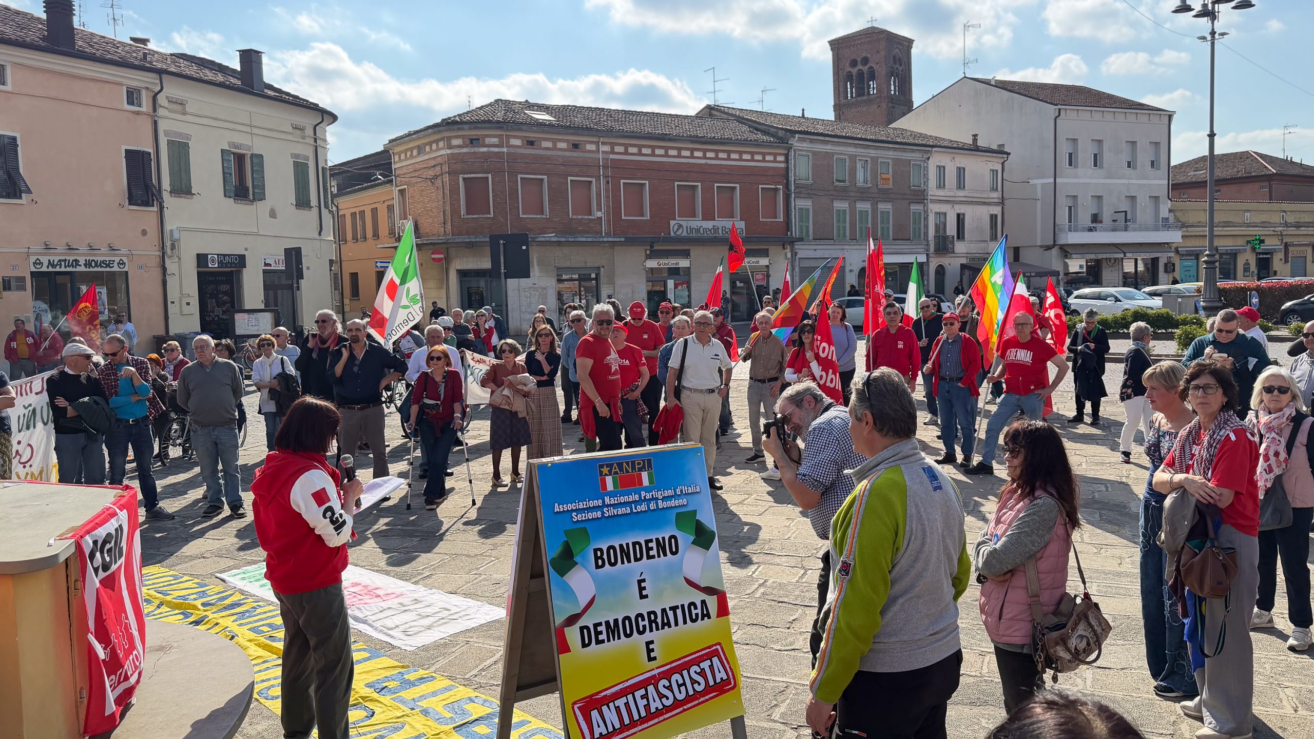 Durissimo l’intervento di Barbara Diolaiti di Rete per la Pace: “Pare necessario reagire contro chi tenta di mascherare un piano eversivo e antidemocratico agitando la teoria del complotto della sostituzione etnica”. Parole che in piazza trovano consenso e applausi. “È evidente che l’obiettivo finale è arrivare a un etno-stato bianco”, denuncia, ricordando come a Bondeno il 16% della popolazione sia composta da cittadini stranieri, “persone che lavorano e contribuiscono alla vita economica e sociale della città”. Il richiamo è esplicito e storico: diritti che si vorrebbero togliere, esclusione istituzionalizzata, ritorni a pagine buie. “Non si può rimanere in silenzio, limitandosi a sperare che nulla di ciò che è già accaduto accada di nuovo. Bisogna scegliere da che parte stare e noi l’abbiamo scelto”.