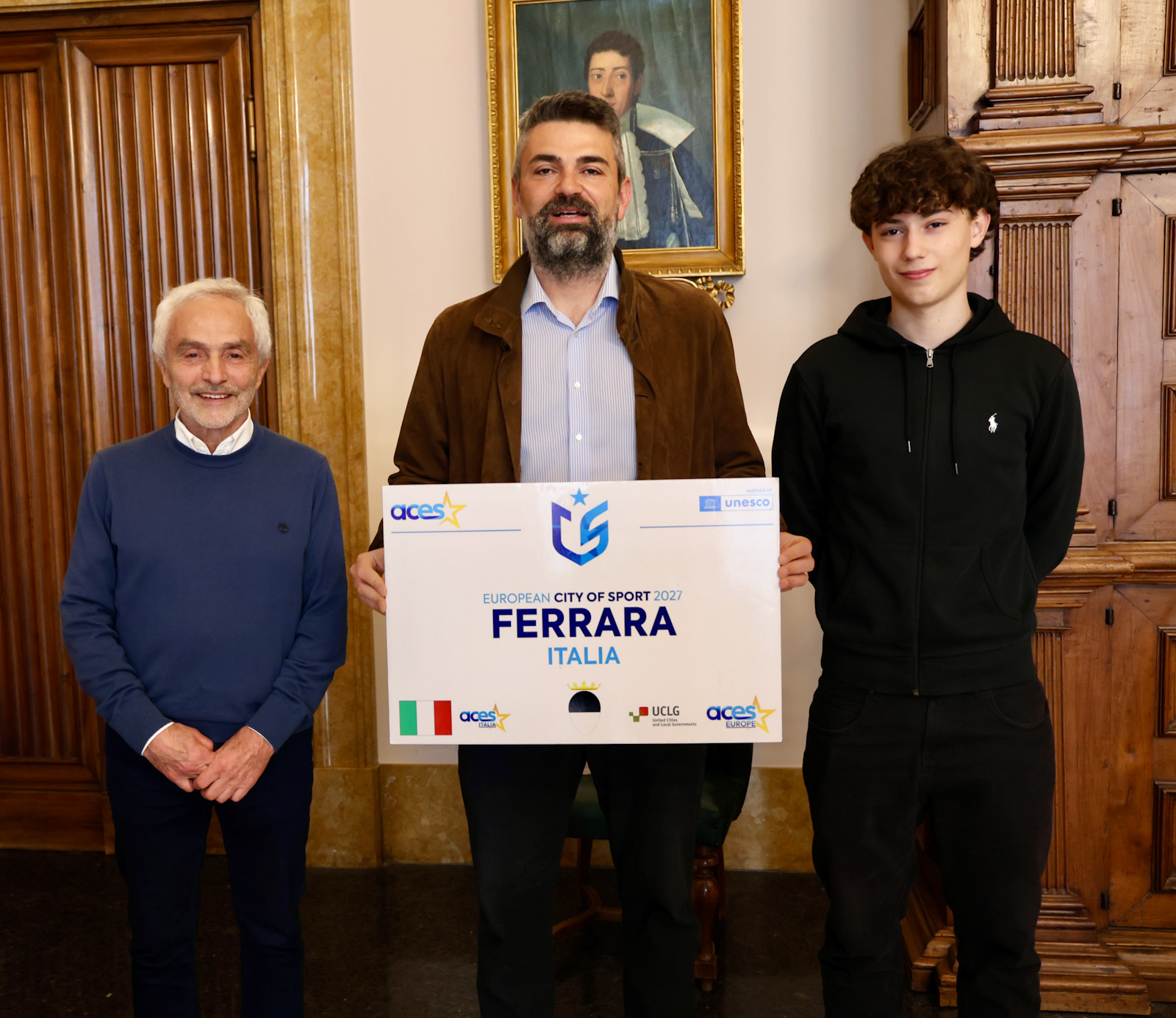 Un momento di valore sportivo e istituzionale quello di martedi 14 aprile nella sala degli Arazzi della residenza municipale. L’assessore allo Sport Francesco Carità ha incontrato Pietro Andreoli, attualmente campione italiano di tennis tavolo nella categoria Under 15, assieme al veterano Enrico Mugellini di recente insignito del titolo di campione italiano Master over 75. Due campioni che ben rappresentano l’espressione del talento e della crescita del movimento sportivo locale e in particolare dell’asdTennis Tavolo Ferrara, che lo stesso Mugellini ha fondato nel 1972.