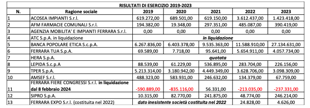 Una tabella nella quale vengono riportati i risultati tra il 2019 e il 2023 che evidenzia la buona performance delle Farmacie Comunali o di Acosea Impianti ma anche quelle pessime di Amsef, di cui da poco è stata confermata la vendita.