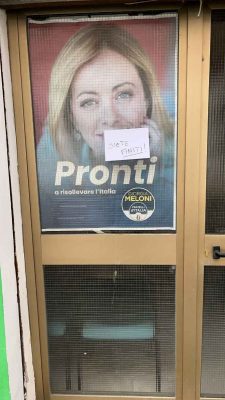 Si tratta del secondo episodio nel giro di circa due settimane. Uno degli adesivi, scritto a penna, riportava la dicitura “Siete finiti” ed è stato applicato sull’immagine della presidente del Consiglio Giorgia Meloni. L’altro, invece, è stato collocato sulla targa del circolo e conteneva un messaggio di natura politica.