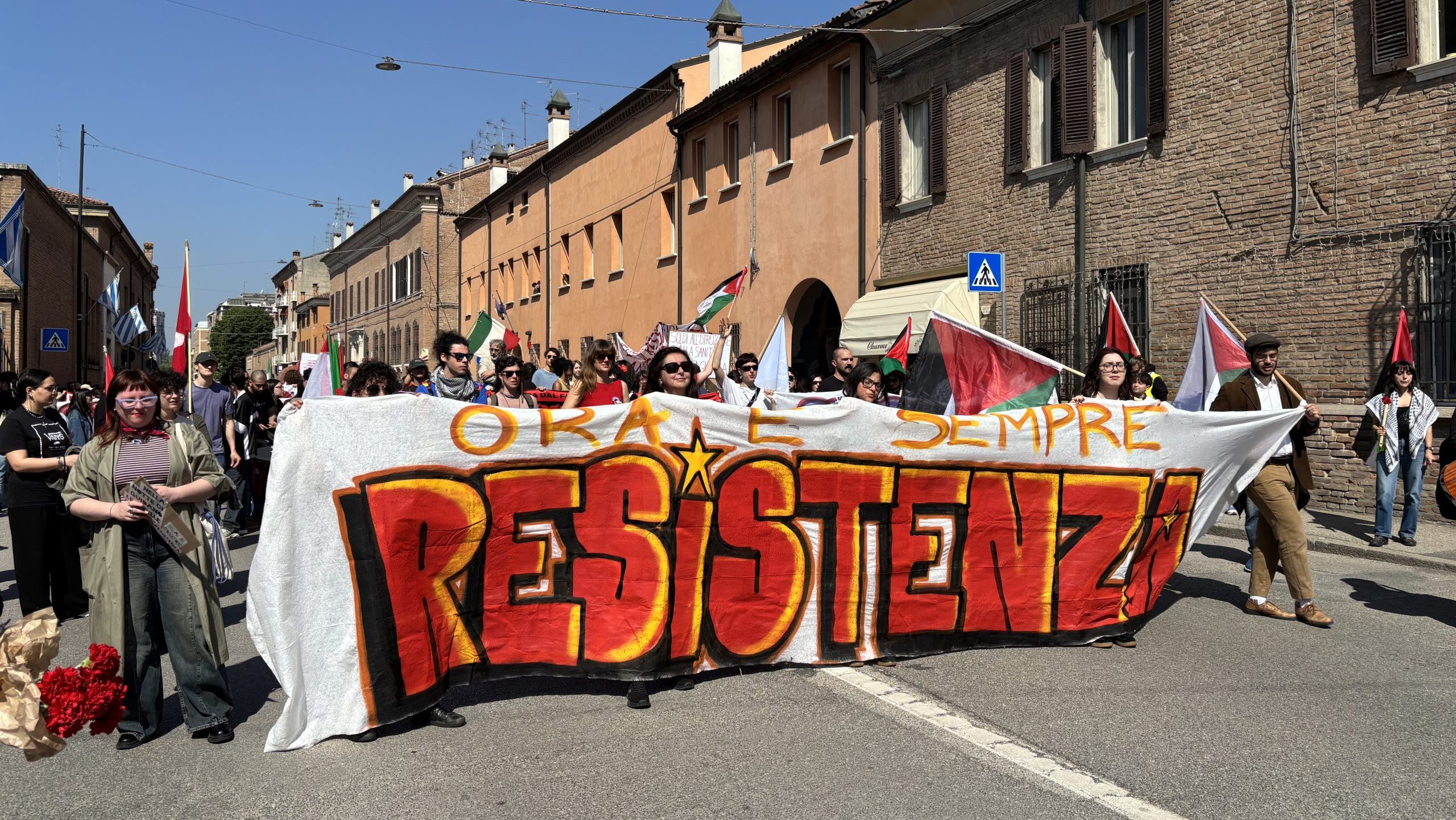 Così dicendo, si riparte. Corso Giovecca è un’esplosione di colori. Uno striscione, con la scritta “Venti di resistenza maree di libertà”, ritrae bene la scena. All’incrocio con corso Martiri della Libertà si tiene la sinistra per poi sostare poco dopo. Lo scrittore Girolamo De Michele scalda la folla proprio davanti al muretto del Castello Estense, dove nel 1943 furono fucilati dal regime undici oppositori: “A combattere contro i nazi-fascisti – ricorda – c’erano anche 12 mila volontari palestinesi. La resistenza italiana stessa era composta da cinquanta nazionalità. Voglio ricordarne una: la brigata dei rom e dei sinti. È l’unica volta che questo popolo ha formato un esercito per combattere una guerra. Anche per loro il fascismo era troppo e bisognava prendere le armi”.