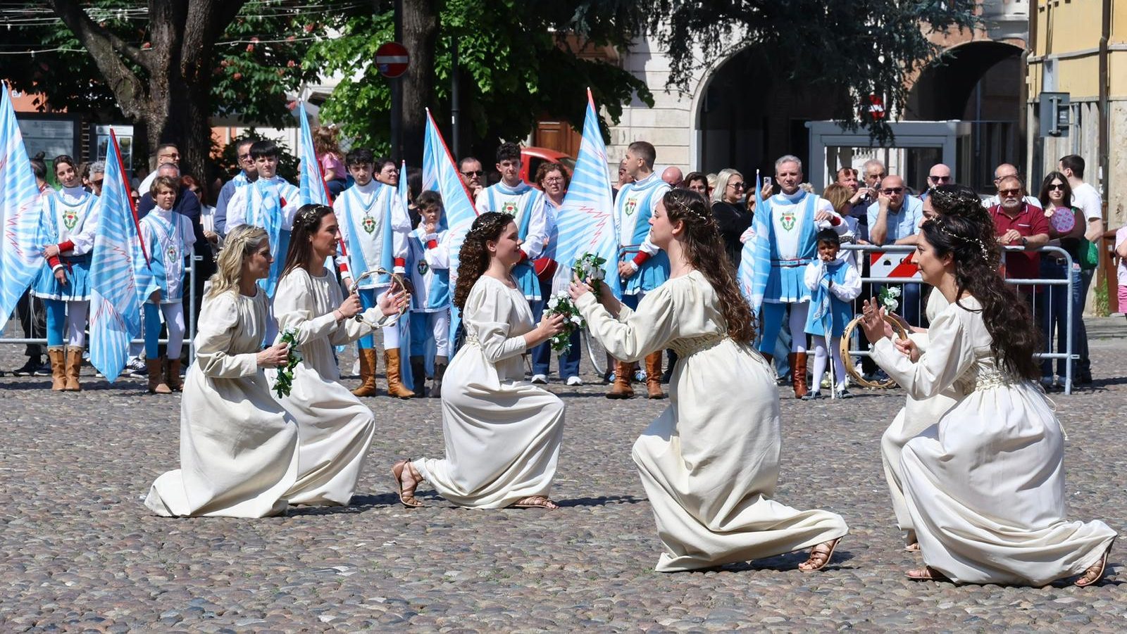 Alle 11.15 la Contrada di San Benedetto ha scelto di raccontare il rapporto tra Borso d’Este e gli artisti della sua corte, a partire dall’iscrizione che ancora oggi campeggia sulla statua del Duca davanti al Duomo: “Principe giustissimo” e “Giustizia fatta persona”. A fare da contrappunto, la lettera che il pittore Francesco Del Cossa scrisse a Borso per reclamare un compenso adeguato per gli affreschi di Palazzo Schifanoia: un dialogo tra potere e arte, tra la retorica celebrativa e la realtà quotidiana di chi quel potere lo serviva.
