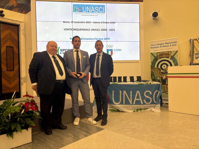 Giovedì, al Salone d’Onore del Coni a Roma, si è svolta la Cerimonia per i 25 anni dell’Unasci - Unione Nazionale Associazioni Sportive Centenarie d'Italia. Anche la Palestra Ginnastica Ferrara 1879 era presente per questo importate momento