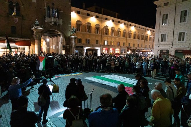 In duecento persone sono scese in piazza Cattedrale, a Ferrara, mercoledì sera (1° ottobre), a sostegno del popolo palestinese per l'iniziativa "Sentinella, quanto resta della notte" – realizzata dal mondo associazionistico ecclesiale in continuità con la Rete Pace ferrarese